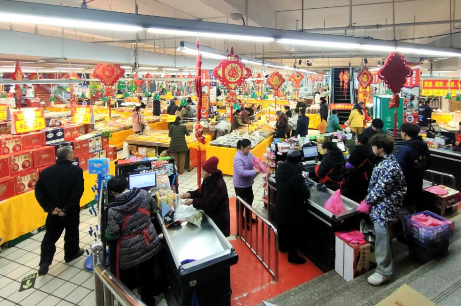 在永乐江超市,一排排暖红的灯笼如流动的火焰点亮年货长廊,目之所及,皆是生活的丰盛与美好。