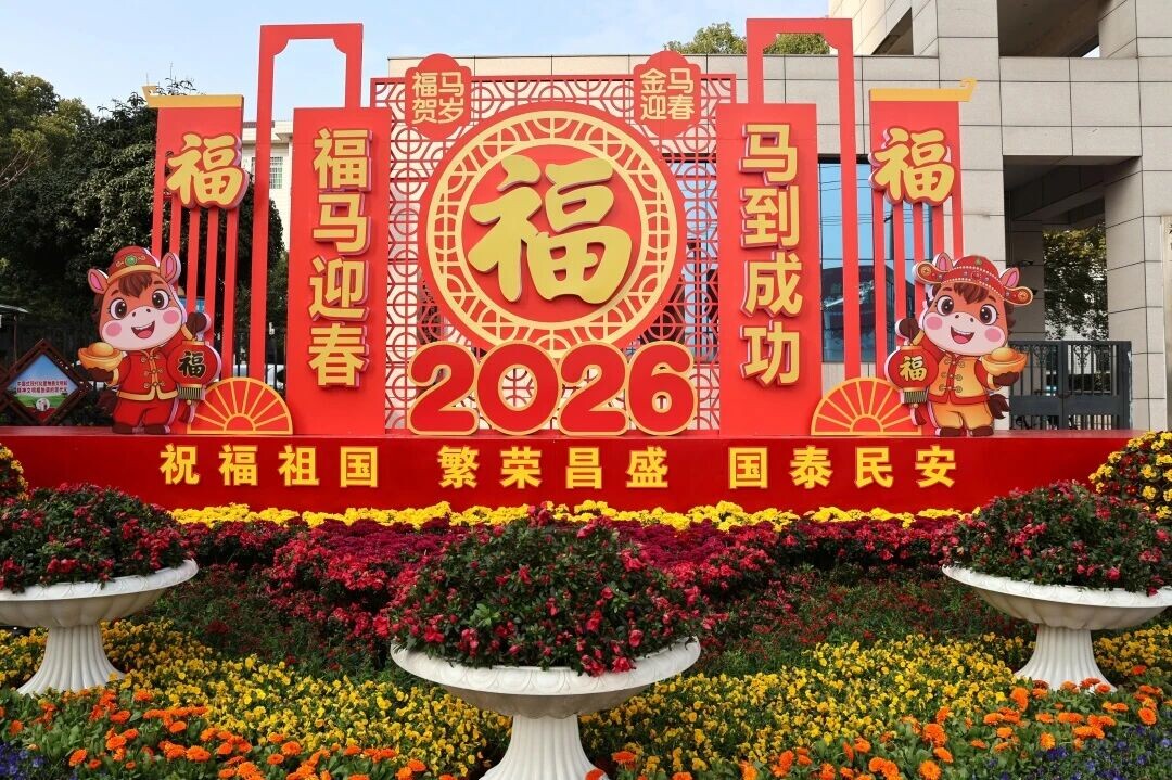 繁花织就新春序章,县委大院门口花团锦簇、暖意融融,伴全县人民共赴 2026 马年新春。
