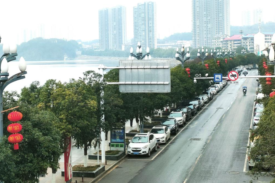 漫步临江路,一串串圆润饱满的红灯笼整齐悬挂于灯杆之上,与苍翠的行道树相映成趣。