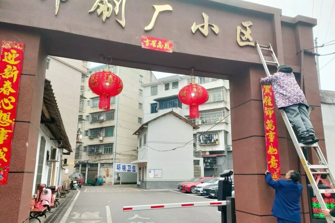 工作人员在小区门头挂灯笼、贴春联,街头巷尾年味渐浓。