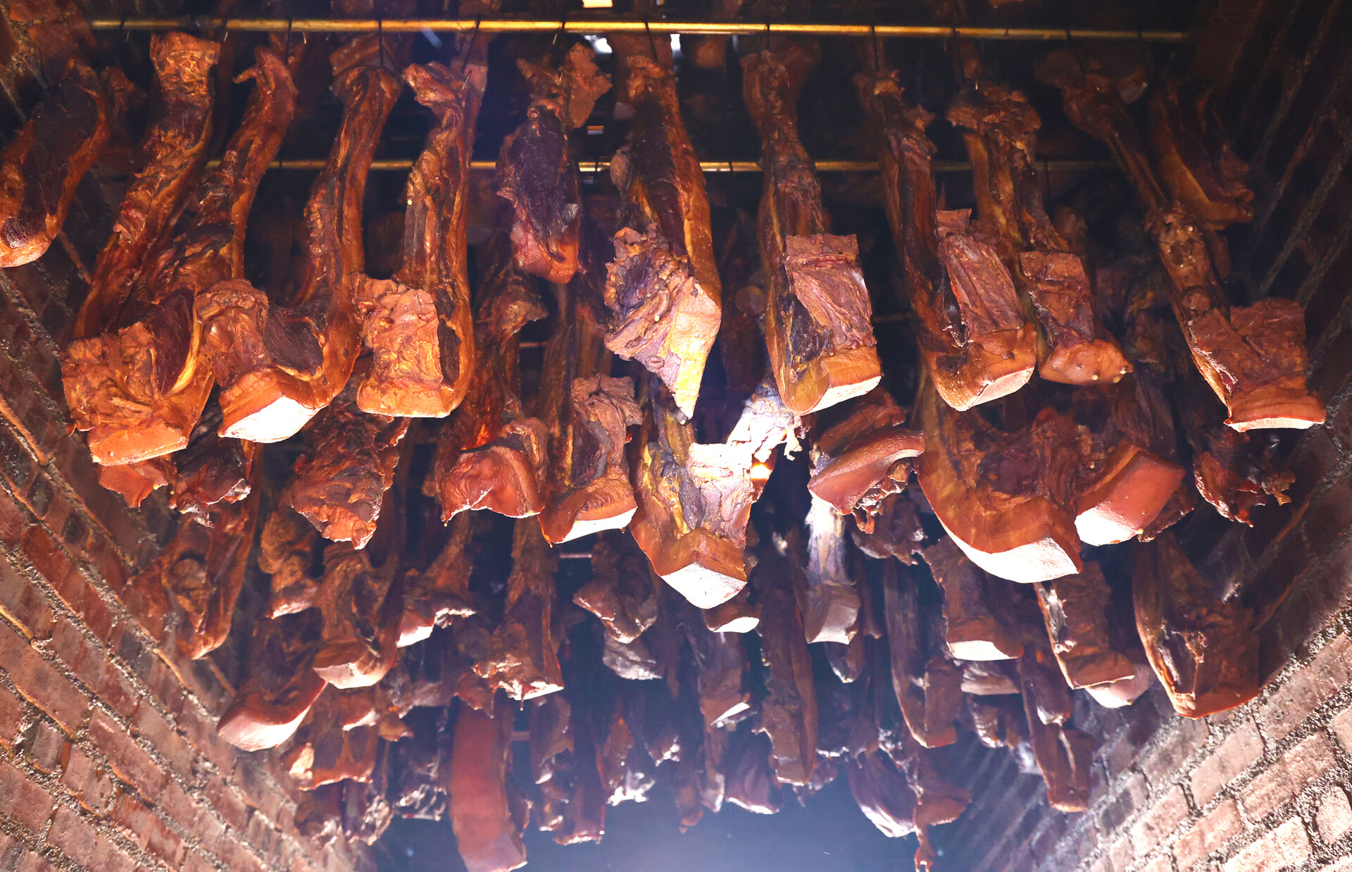 腊肉选用本地土猪,当天宰杀当天腌,除了食盐料酒,没有任何添加剂。厂子的每个烤房门口都安装了温度计,不同阶段的火候被精准拿捏,每一批腊肉经过近两个月的烘烤才能出炉,“外焦里嫩”在这可是大忌。猪血丸子先手工捏圆,晾晒到位后再小火慢熏。腊猪脚主要选用肌肉发达,肉质紧实的前腿,嚼劲十足……这里的每一道工序,都没走任何捷径,更没有科技与狠活。