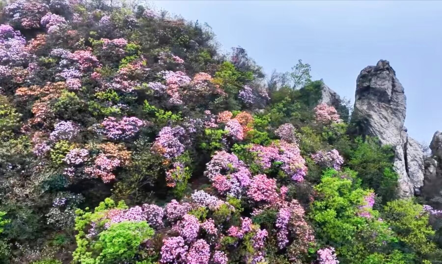 登高远眺,川岩山的陡峭崖壁与缓坡之上,鹿角杜鹃层层叠叠、连绵不绝。淡粉、浅紫的花朵簇拥成球,缀满枝头,与苍翠的山林相映成趣,微风拂过,花海翻涌,暗香浮动。不同于普通杜鹃,鹿角杜鹃因花冠呈鹿角状得名,树形挺拔,花朵硕大,花色清丽,是川岩山原生的特色观赏花卉,每年清明至谷雨时节如期盛放,花期可持续月余。