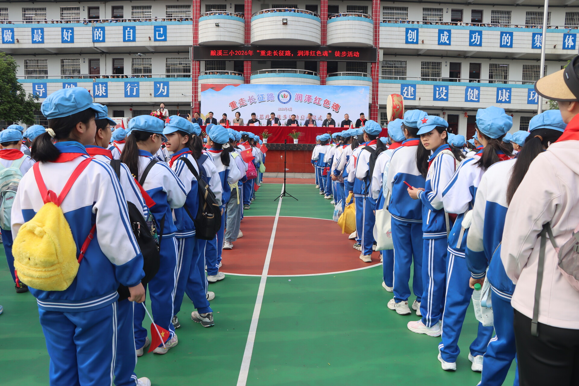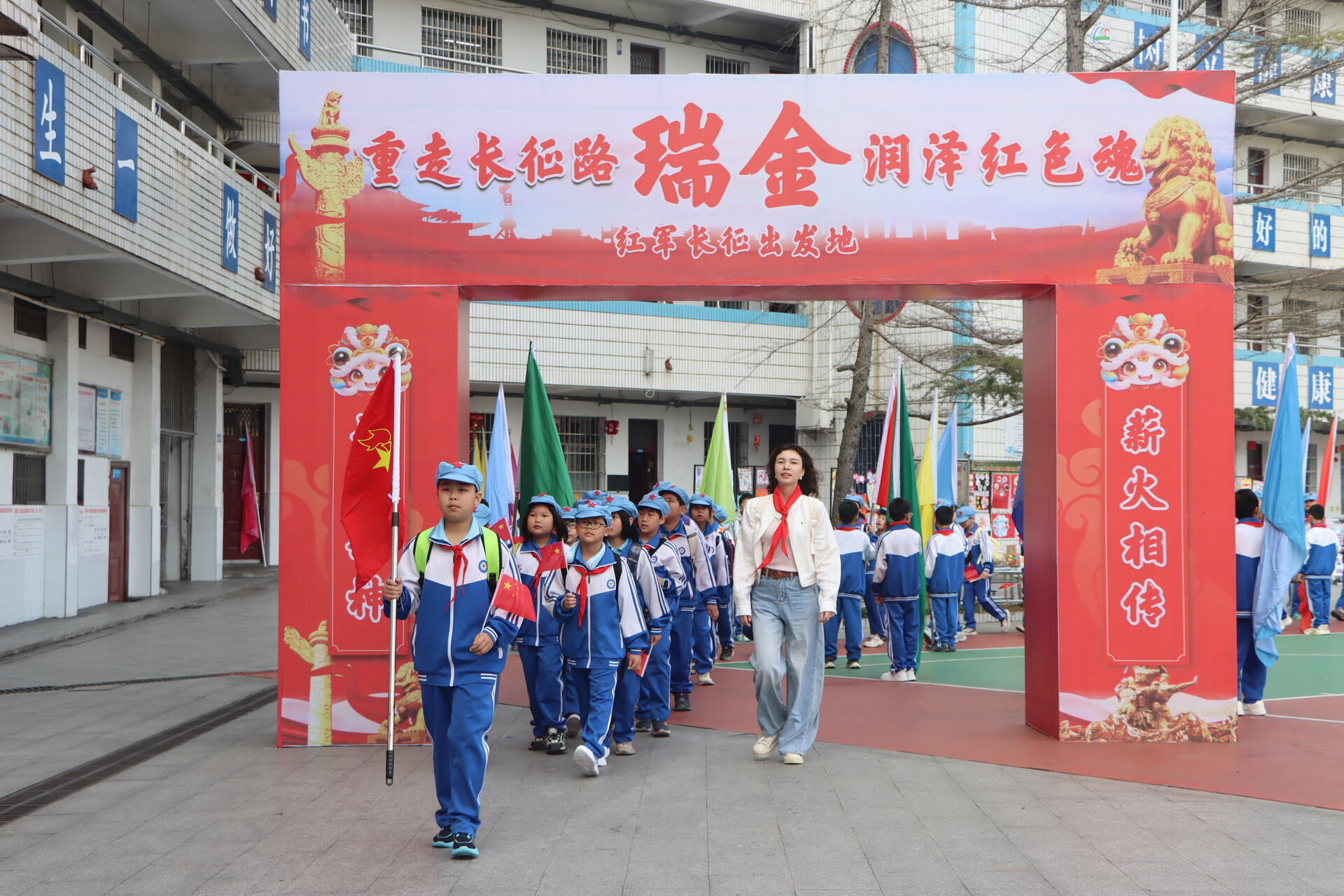上午8时20分,500余名师生列队整齐、手持班级旗帜,以饱满的精神状态开启了一场沉浸式的红色精神洗礼。歌曲《立春》唱响春日希望,火炬传递仪式寓意长征精神代代相传、生生不息,擂鼓助威气氛热烈而庄重,展现出新时代少年的昂扬斗志。