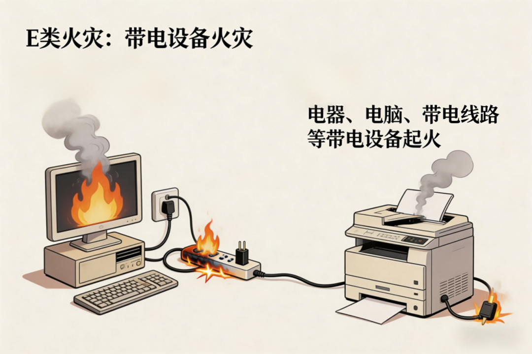 E 类火灾:带电设备火灾,如电器、电脑、线路等通电状态下的火灾;