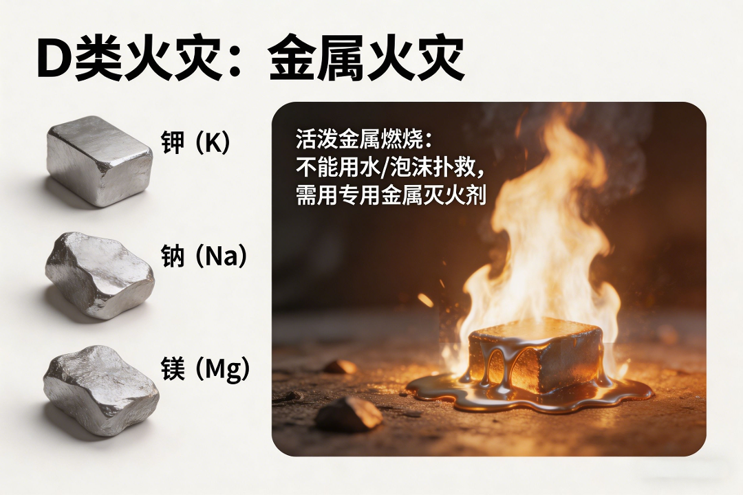 D 类火灾:金属火灾,如钾、钠、镁等活泼金属燃烧(需专用灭火器);