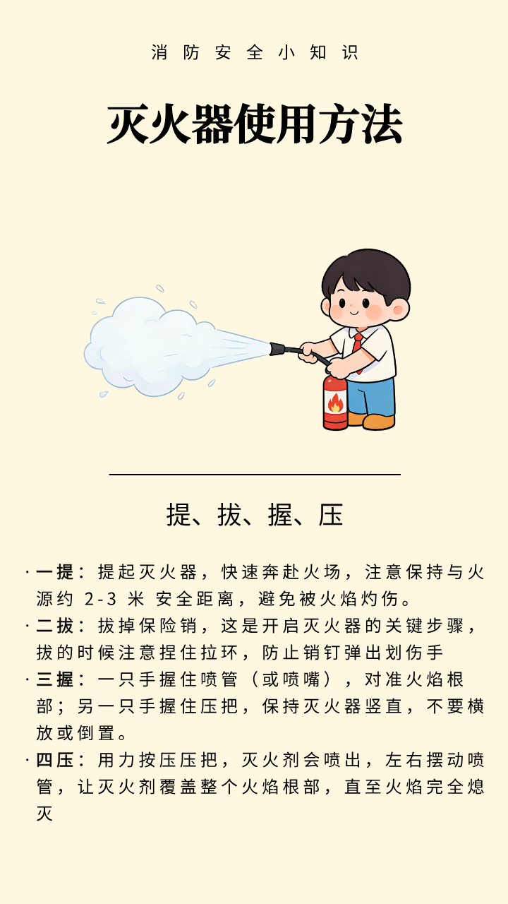 1.干粉灭火器:能灭固体(木材 / 纸张)、液体(汽油 / 酒精)、气体和电气火灾,家庭、办公、车辆都适用。