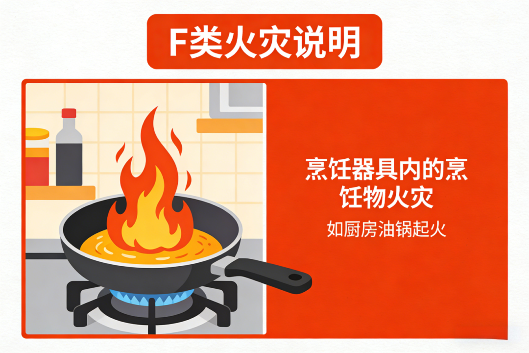 F 类火灾:烹饪器具内的烹饪物火灾,如厨房油锅、煎炸食物起火。