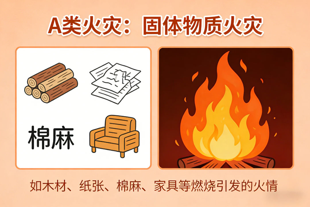 A 类火灾:固体物质火灾,如木材、纸张、棉麻、家具等燃烧引发的火情;