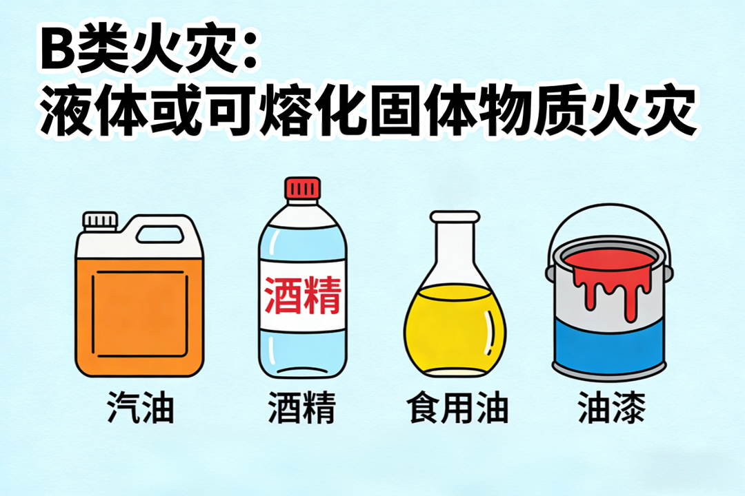 B 类火灾:液体或可熔化固体物质火灾,如汽油、酒精、食用油、油漆等;