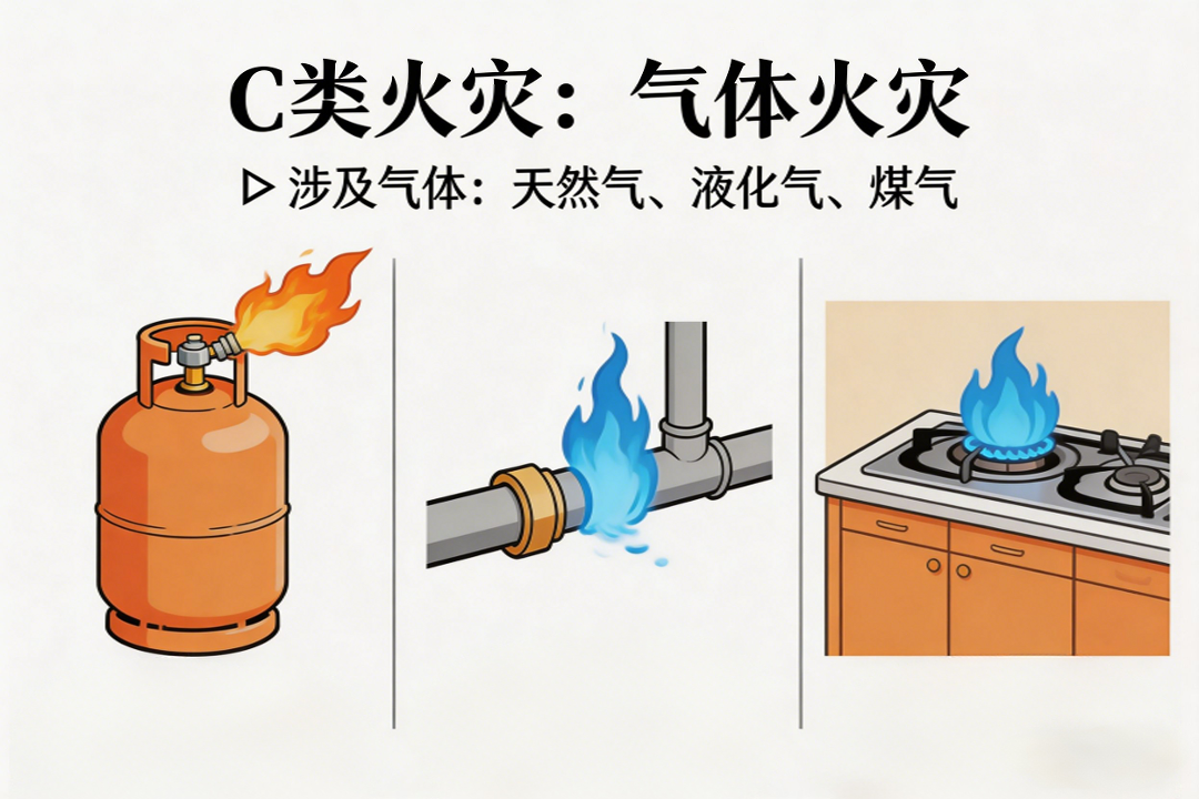 C 类火灾:气体火灾,如天然气、液化气、煤气等可燃气体泄漏燃烧;