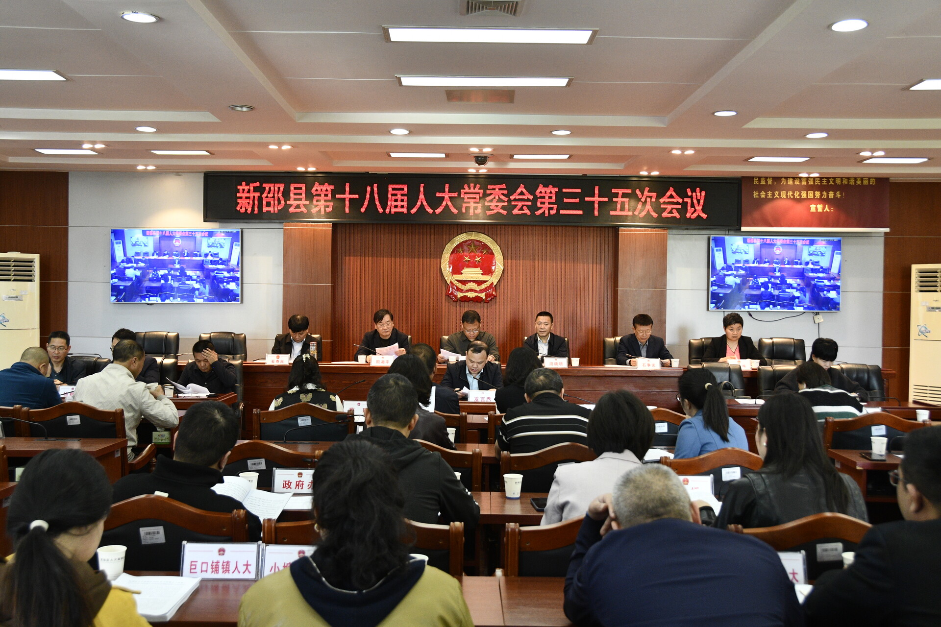 新邵新闻网4月23日讯(记者 寻健)4月23日,新邵县第十八届人大常委会第三十五次会议在县人大常委会会议室召开。县人大常委会主任刘长峰主持会议,县人大常委会副主任周晓明、周湘平、石争光、石奇民、唐艳梅参加会议。