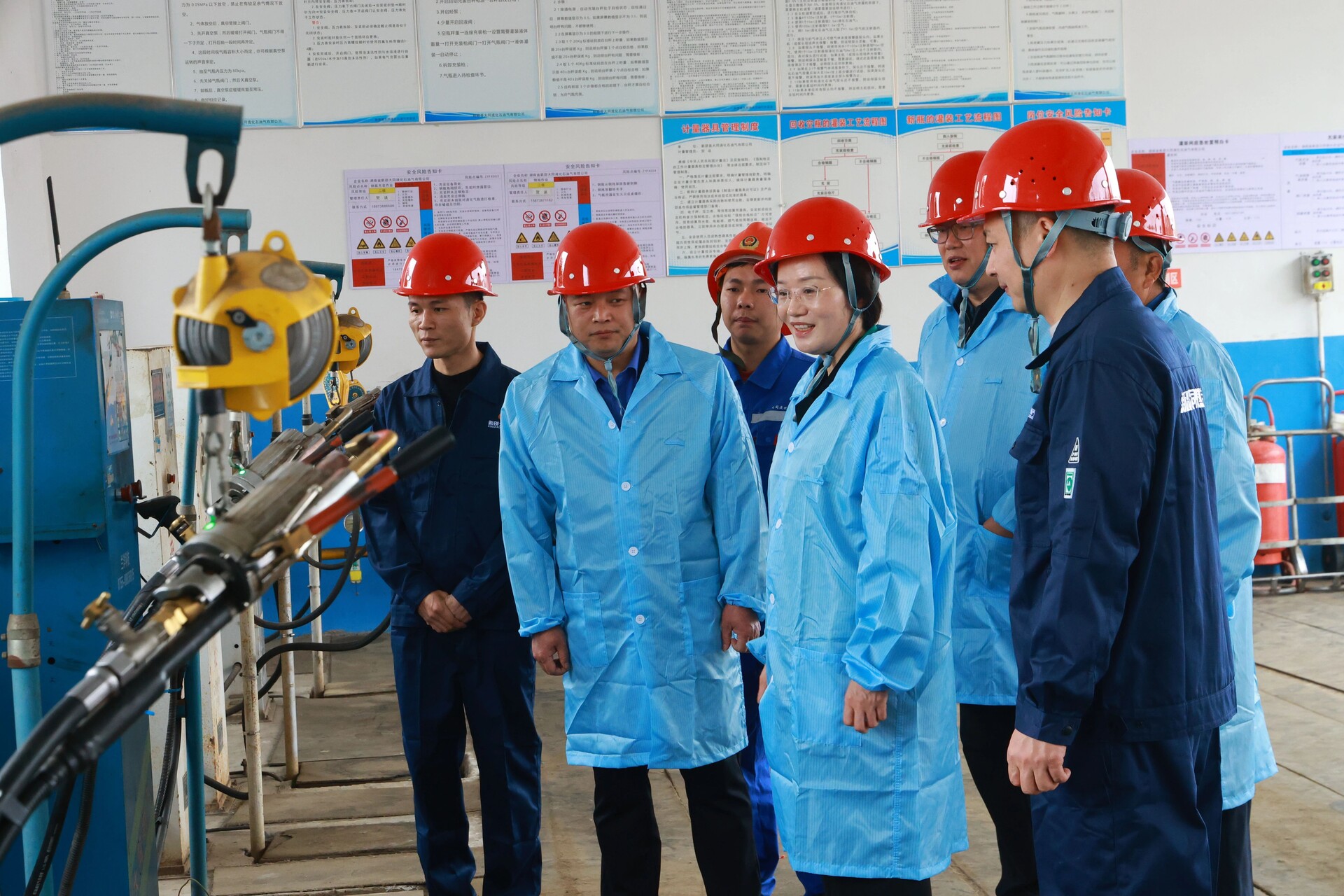 在坪上镇大同液化石油气有限公司,黄海蓉一行来到储罐区、充装台等核心区域,实地检查储罐运行、充装操作规范及防护设施配备情况,询问设备巡检、应急预案制定等细节。她强调,燃气安全涉及千家万户,企业要严格执行安全管理制度,加强全链条风险排查,确保各环节安全可控。同时要广泛开展安全宣传,普及用气知识、提升操作技能,形成企业自律、部门监管、群众参与的格局,筑牢燃气安全防线,保障群众生命财产安全。