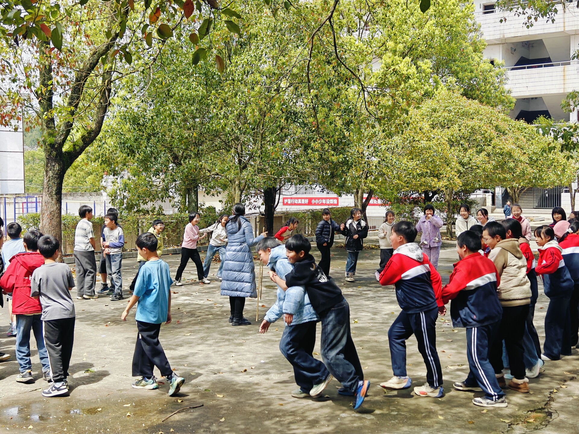 随后的“群龙取水”将活动推向高潮。每组八名同学合力取到两米开外的矿泉水瓶,全程不使用任何器材。只见孩子们紧紧拉住同伴的手臂,稳稳托住队友的身体,大家齐心协力、相互支撑。“再往前一点,我们拉住你!”“放心,我们不会松手!”在彼此信任与默契配合中,矿泉水瓶被成功取到,欢呼声、掌声响彻操场。