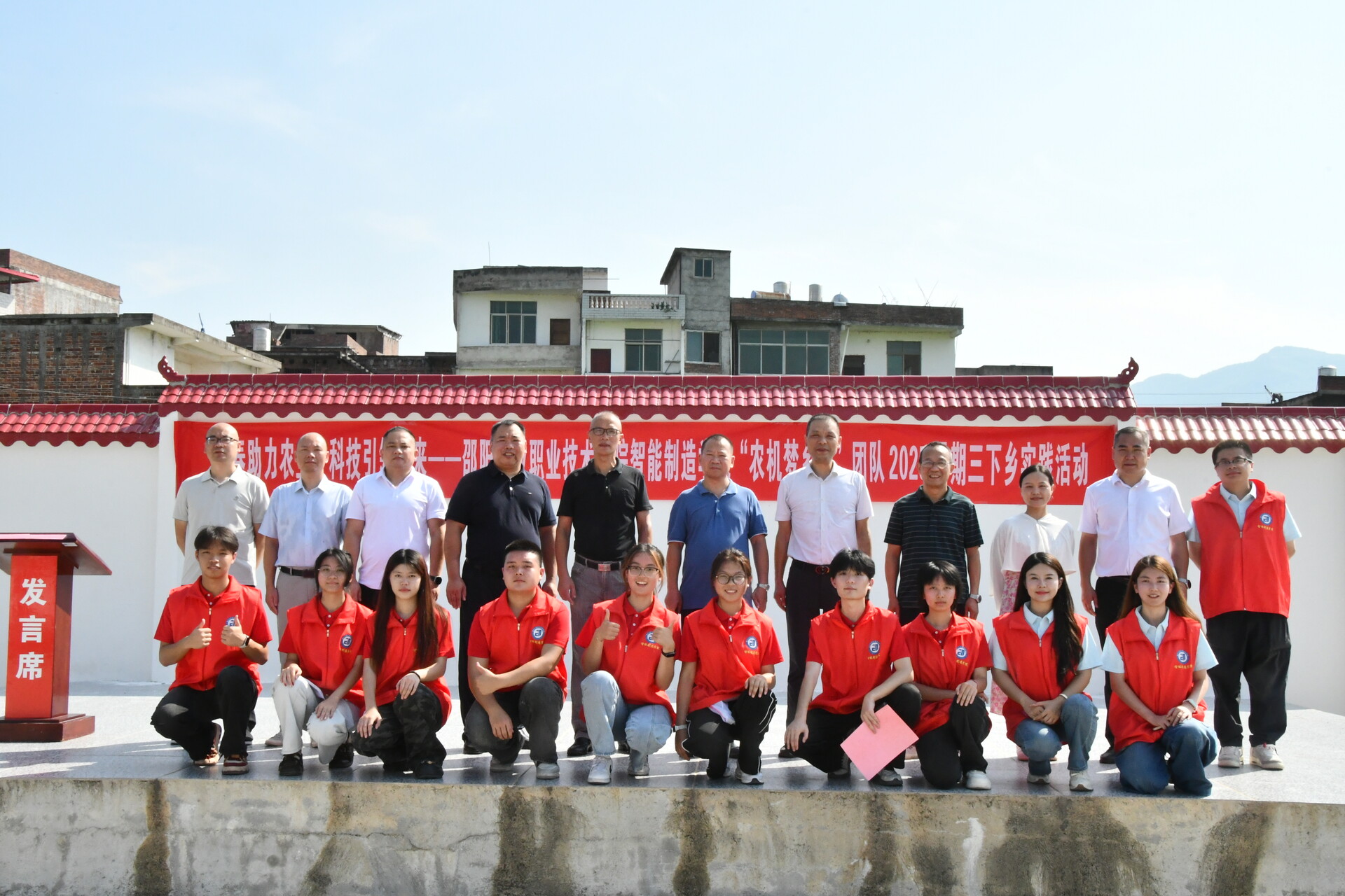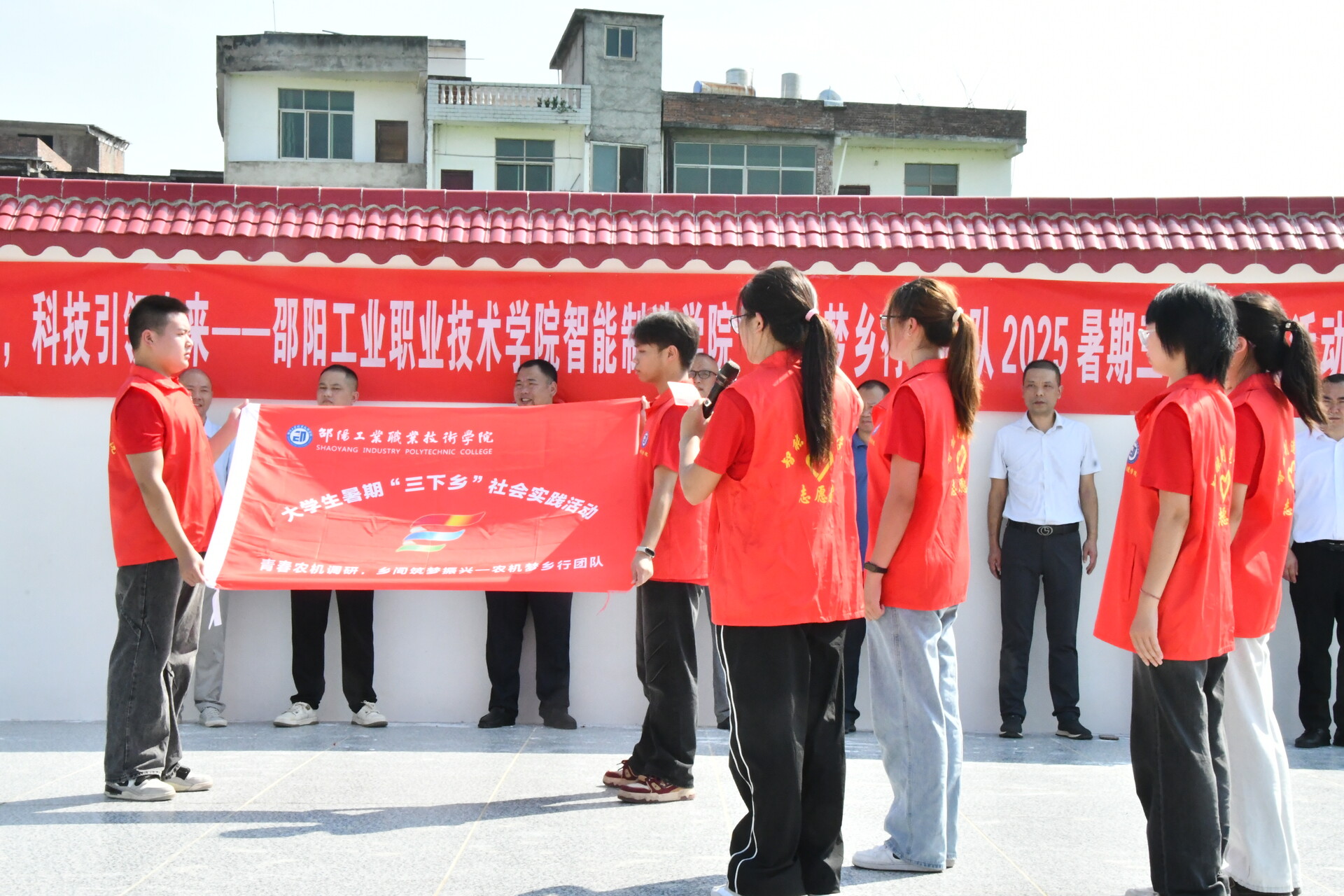 仪式上,新邵县巨口铺镇党委书记危春风致欢迎词,对实践团队的到来表示热烈欢迎,期待学子们以专业所长助力当地农业发展。邵阳工业职业技术学院党委副书记李鑫强调,此次活动是学院落实产教融合、服务乡村振兴的重要举措,鼓励队员们在实践中锤炼本领、服务“三农”。新邵县委常委、副县长李繁荣肯定了活动对推动当地农机化升级的积极意义,他指出,新邵县正全力推进农业机械化与智能化融合,迫切需要专业技术力量加持,希望通过此次合作,既能解决农户当下的农机使用难题,更能为县域农业高质量发展注入长效动力,校地携手共促农业现代化迈上新台阶。邵阳市科学技术局党组副书记、副局长李锋为团队授旗,全体队员庄严宣誓,承诺以严谨态度投入实践,为乡村振兴贡献青春力量。