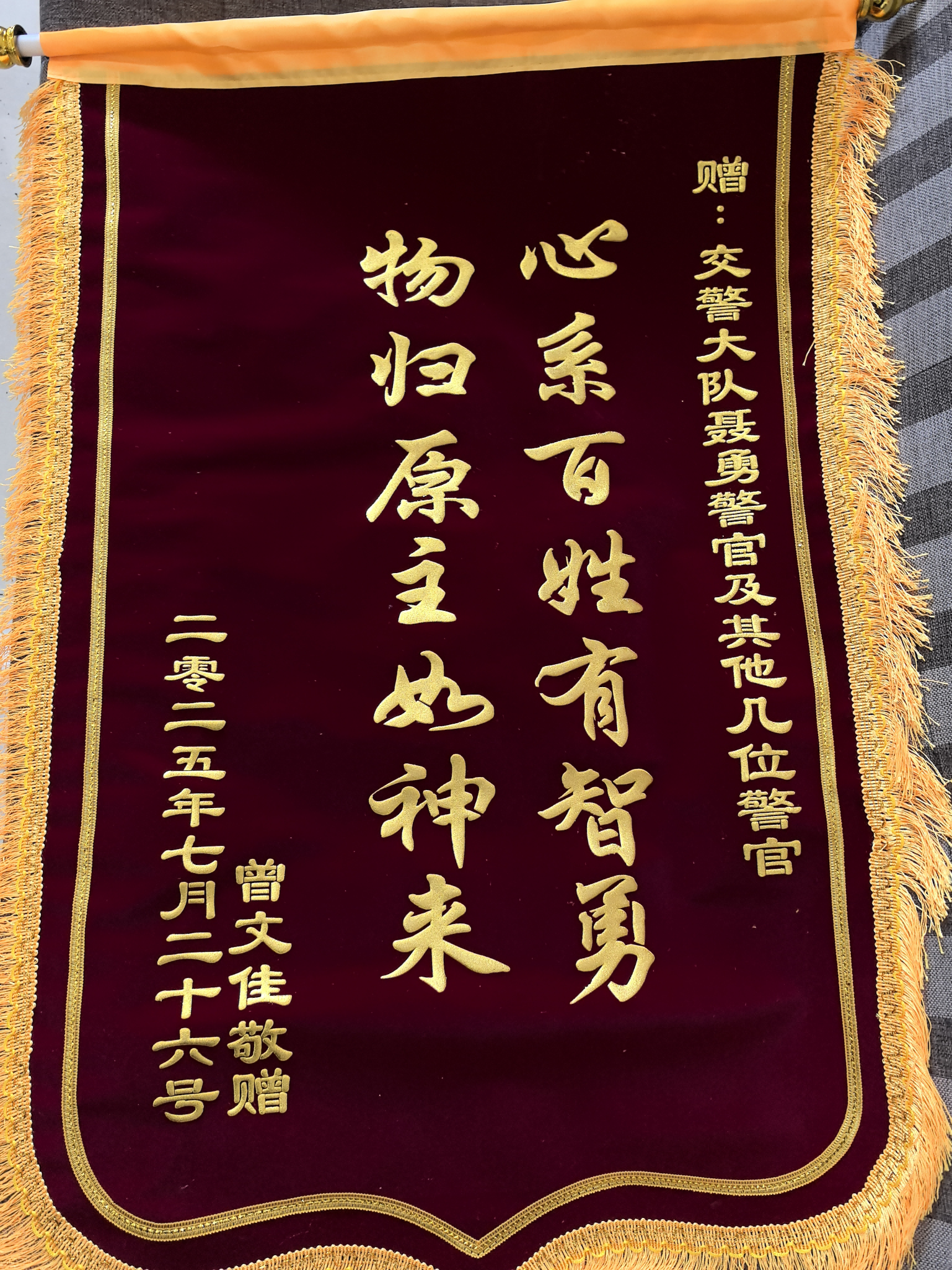 “太感谢你们了,不然我这损失可就大了!” 已赶往外地的曾女士在电话中再三致谢,并特意定制锦旗表达心意。从接警到寻回手机,新邵交警用高效行动诠释了为民服务的初心。