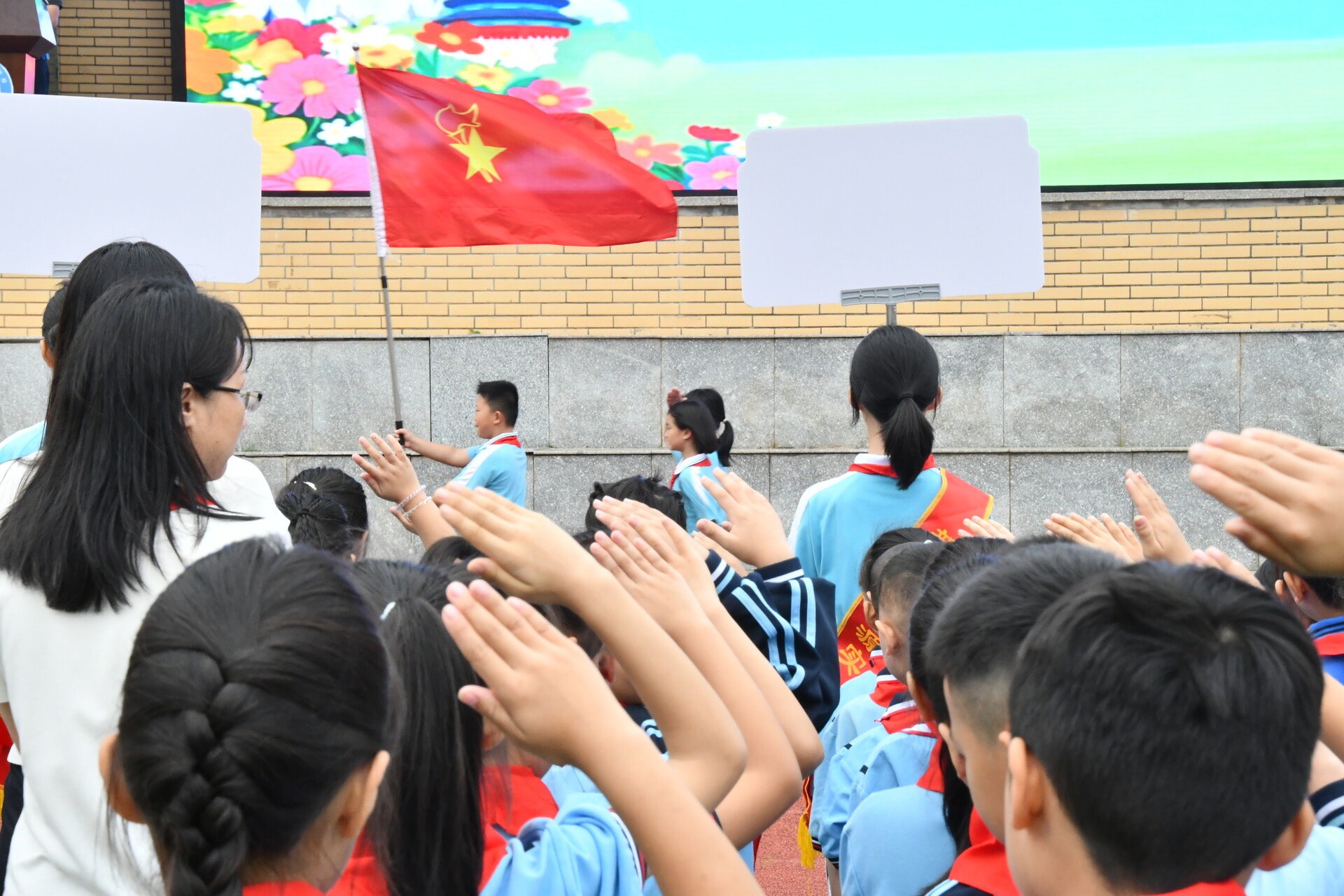 活动在开场节目《民族团结一家亲》朗诵表演中拉开帷幕。少先队员们用真挚的情感和铿锵的语调,抒发了对祖国大家庭深厚情谊的理解与歌颂,展现了各族人民团结一心、亲如一家的动人画卷,为整个仪式营造了庄严而温暖的氛围。随后,仪式在庄重的出旗曲中正式开始,旗手们迈着整齐有力的步伐护送队旗入场,全体少先队员肃立敬礼。队员们齐声高唱《中国少年先锋队队歌》,嘹亮的歌声展现了新时代少先队员昂扬向上的精神风貌。