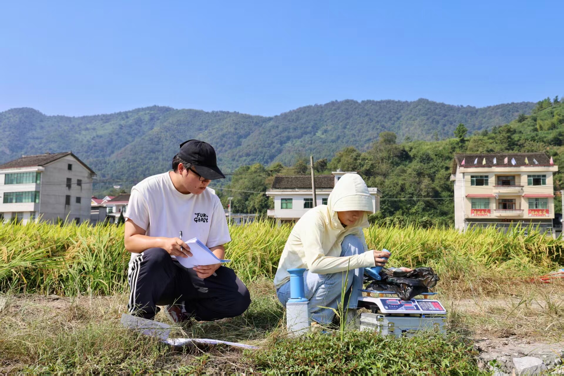 在忙着收割的同时,测产工作人员也来到艾利铭的晚稻田里,随机选取了5个采样点进行丈量、划块、收割、脱粒和称重,全程严谨规范。经测算,该示范田亩产达到580公斤,创下新高。