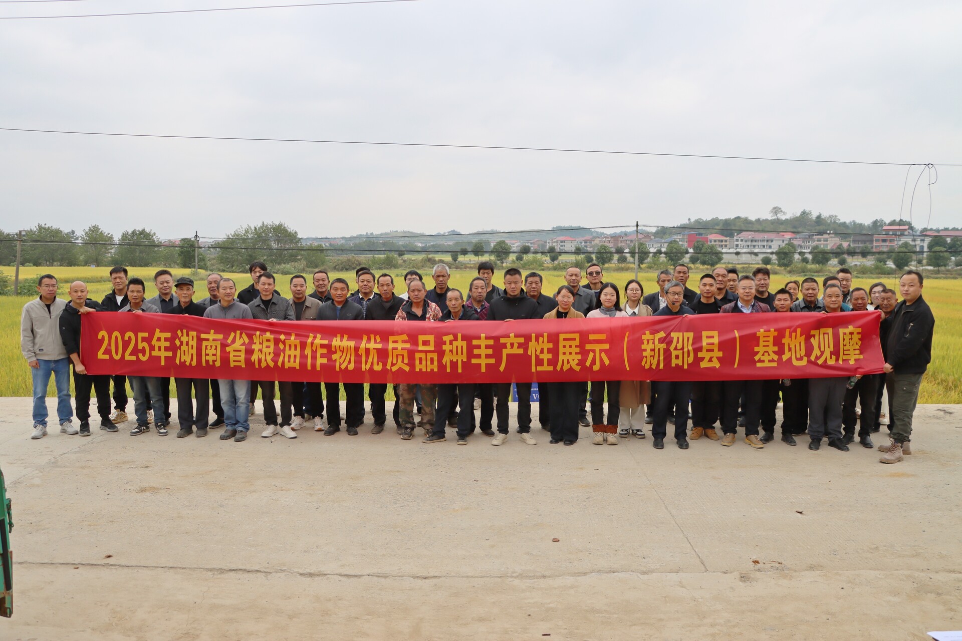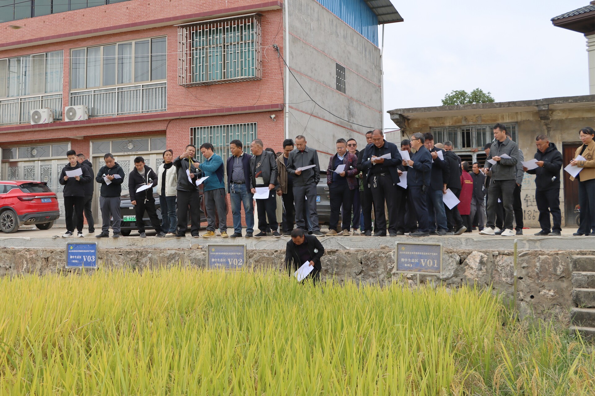 新邵新闻网10月23日讯(记者 杨明航 肖晔)秋日的新邵县陈家坊镇富阳村,102亩展示基地里稻浪翻滚,21个晚稻优质品种在此展开“擂台赛”。10月22日,2025年湖南省双季晚稻优质品种丰产性展示观摩活动在此举行,全县各乡镇70余名农技人员、种粮大户齐聚田间,在“看禾选种”中探寻增收密码。