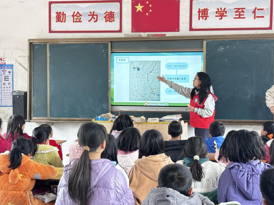 在室内宣讲环节,宣讲团成员结合高冲完全小学坐落下源水库之畔的地理特点,精心打造了富含本土元素的“绿满湘野”主题课件,围绕水资源保护、秸秆焚烧危害、垃圾污染防控等内容展开系统讲解。通过“河水是否变脏?”“秸秆焚烧带来哪些影响?”等贴近学生生活的提问与盲盒问答的互动形式,激发思考、引导共鸣。结合实地案例与科学知识,宣讲员深入浅出地阐释了水土气协同治理的重要性,倡导“秸秆还田、资源化利用”等绿色生产方式,号召学生从自身做起、从小事做起,共同守护“清清资水、美美新邵”的生态家园。