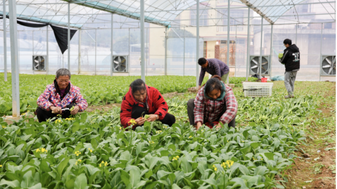 正在采摘小青菜的肖丽芳笑着说:“在大棚里干了八年活,暖和又有收入。老板对我相当好,工资每天现结,做起来很开心。”